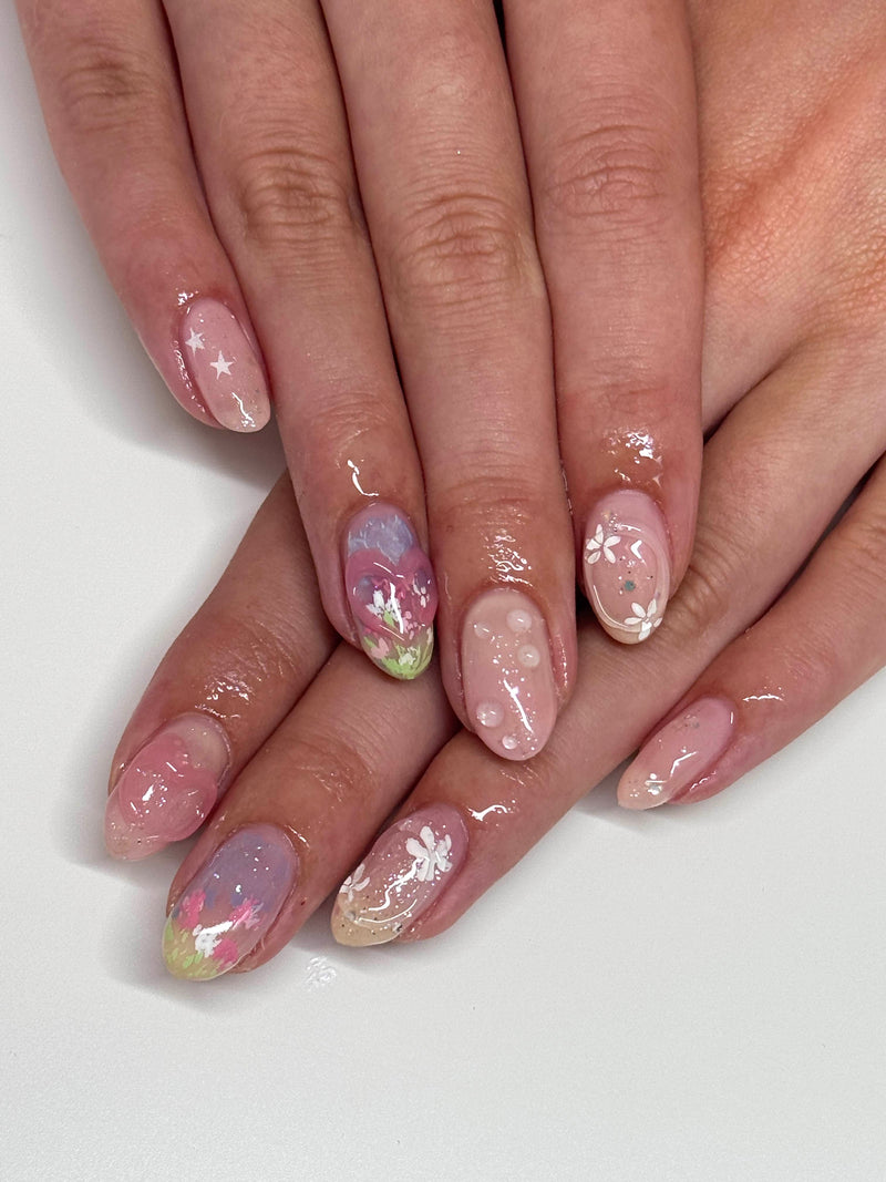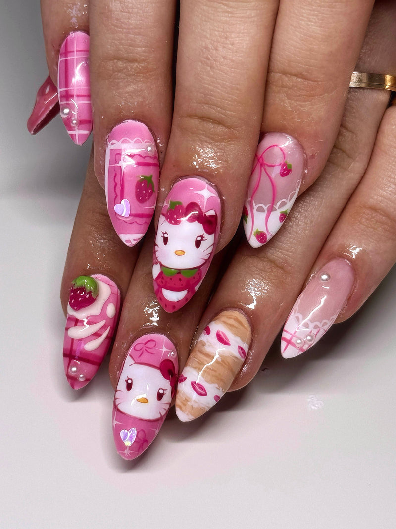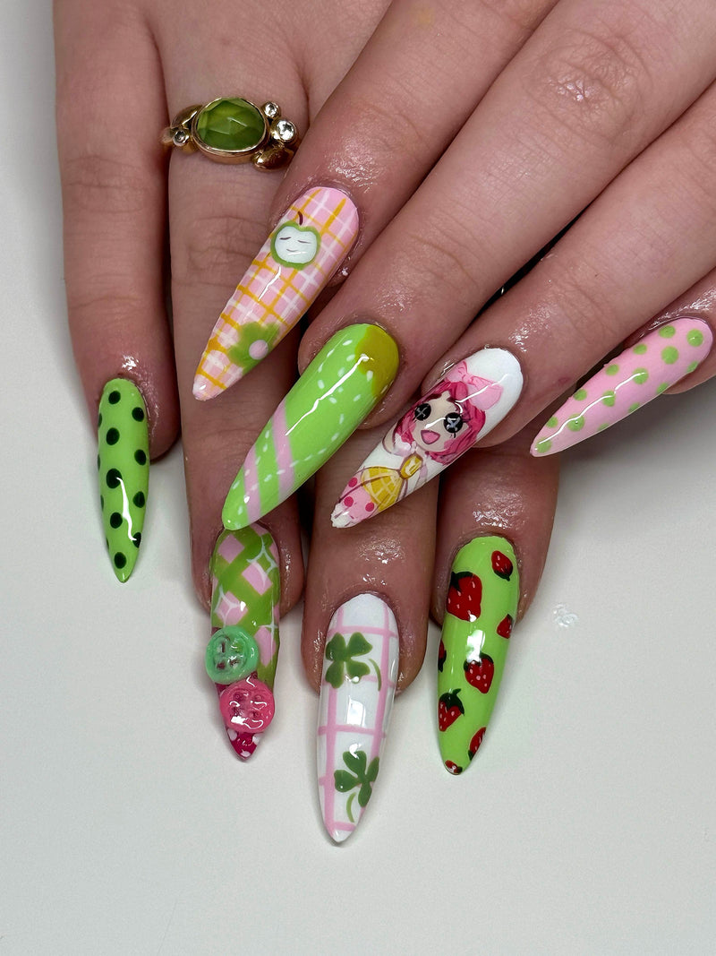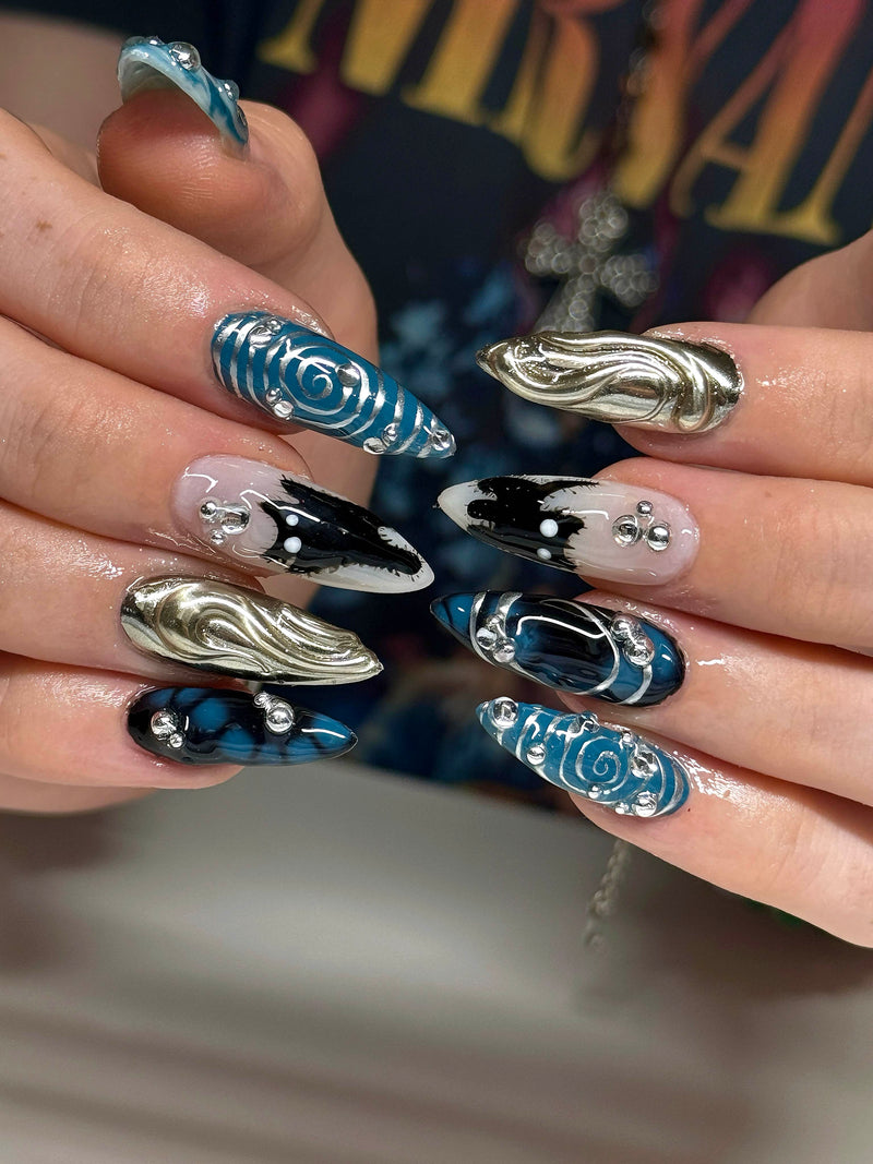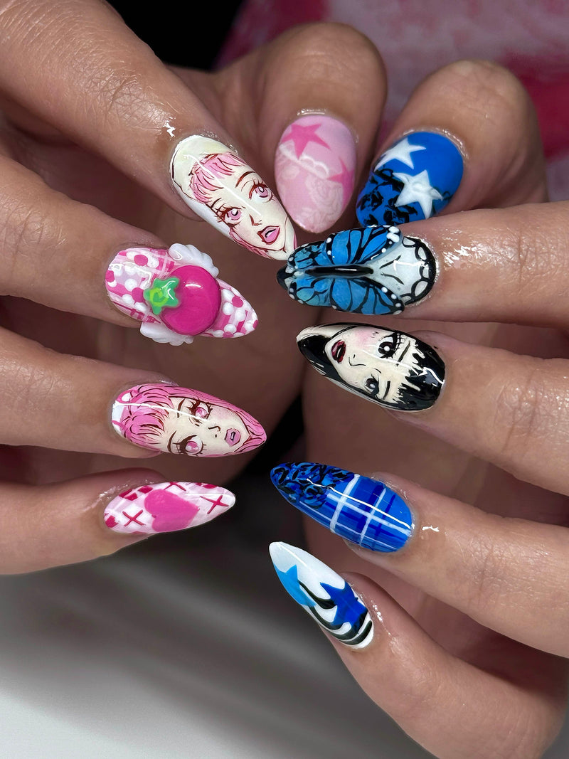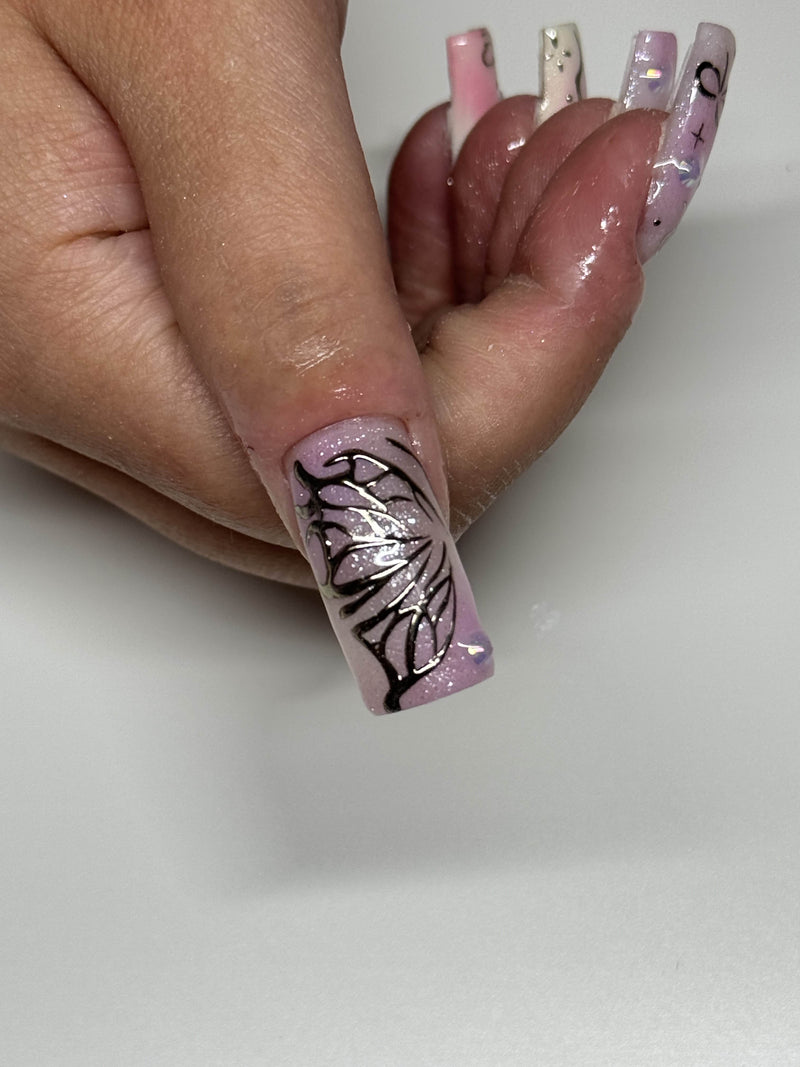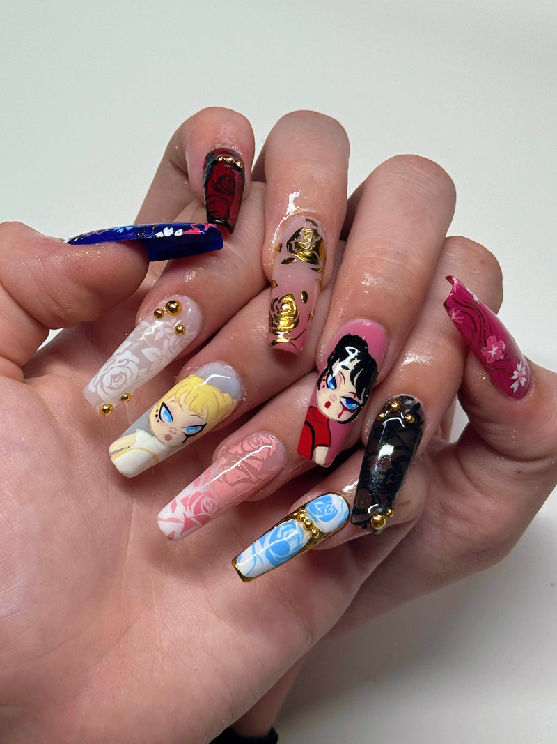 A uniquely designed nail set made just for you! Pick out a theme you'd like as a nail set, such as movies, anime, art, books, characters, etc. I'll make a design that matches your theme. All nail inspo MUST be sent via Insta dm's prior to appointment.